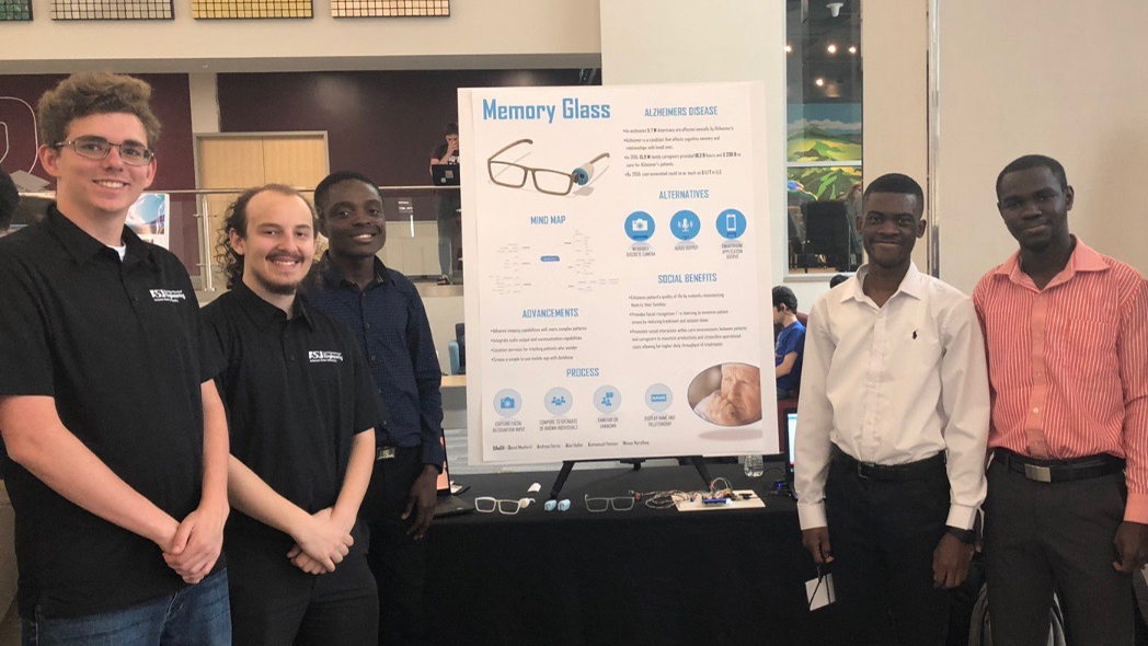 Above: Members of Team DAAEH (from left to right: Alexander Hollar, Andrew Deros, David Manford, Emmanuel Hanson, Hasan Nurulhaq) developed Memory Glass, a product intended to help patients with Alzheimers with real-time reminders of the identities of the people they are currently speaking with. The team developed the concept during Devils Invent: Invent for the Planet and presented their project in College Station, Texas. Photo courtesy of Devils Invent